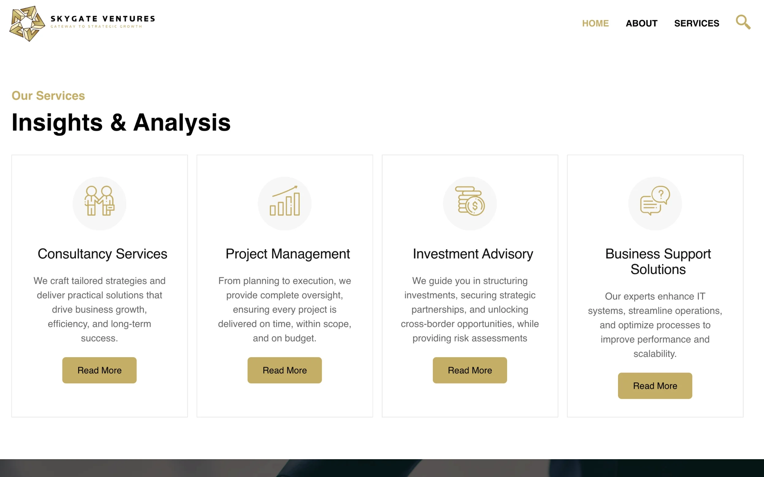 The website effectively positions Skygate Ventures as a trusted partner for strategic advisory and project consultancy. With improved clarity and professional presentation, potential clients can easily understand services and connect with the company, supporting business growth and long-term partnerships.
