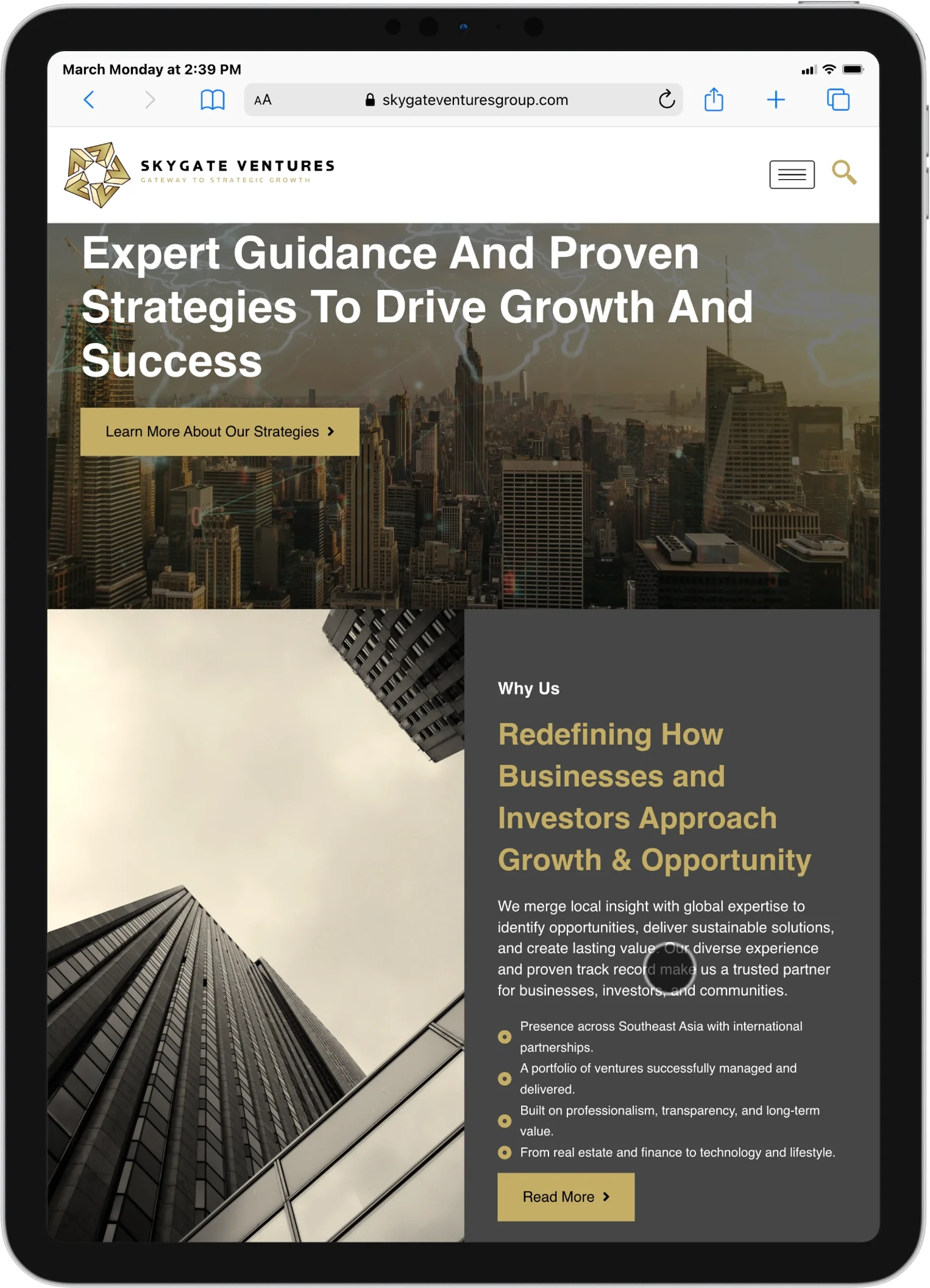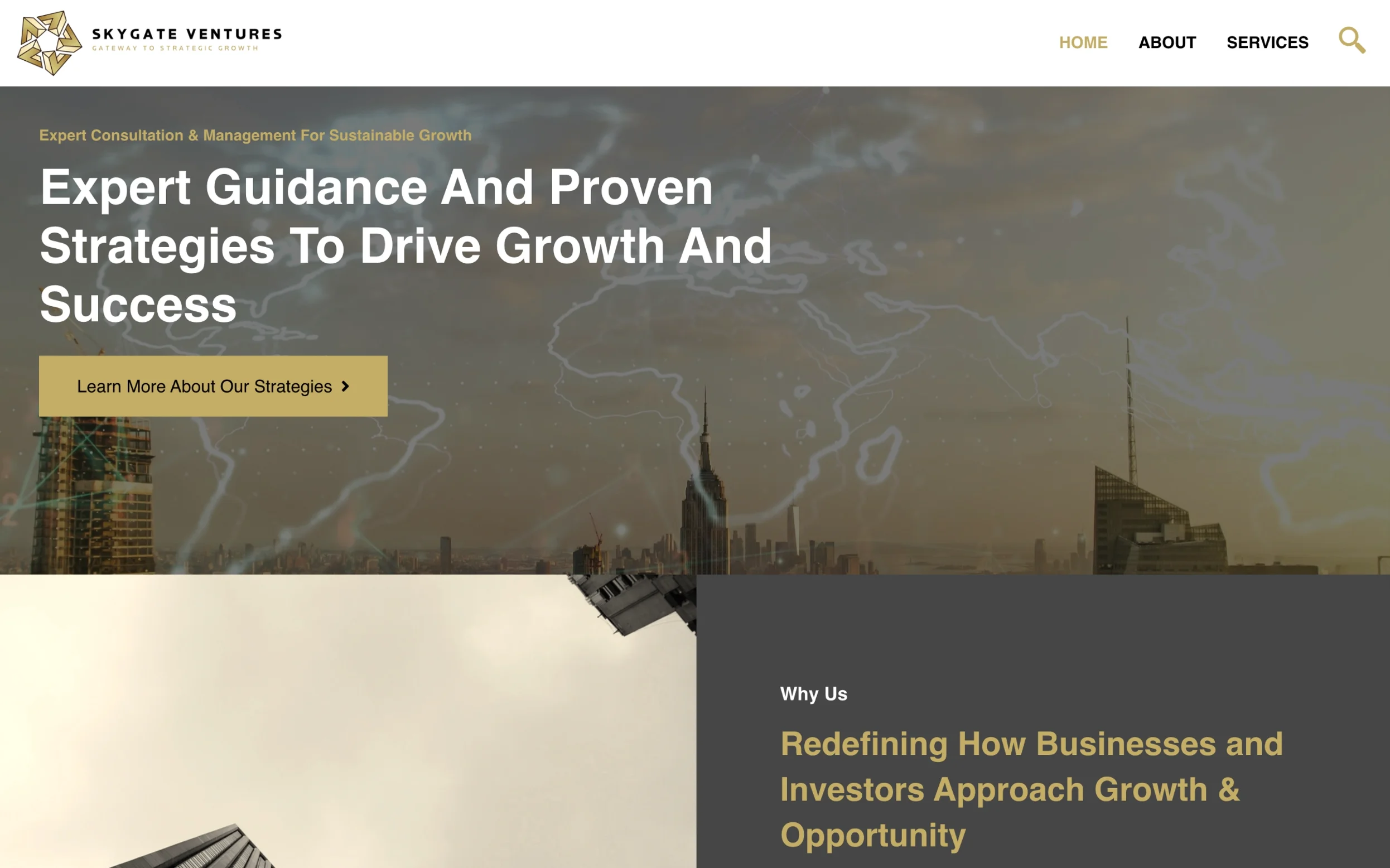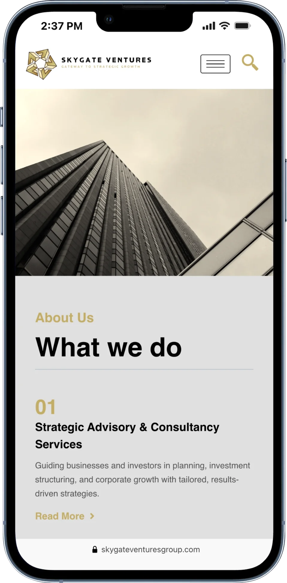 Skygate Ventures needed a professional website to reflect its unique approach of combining local insights with global expertise. The platform needed to communicate the company’s ability to identify opportunities, deliver sustainable solutions, and provide strategic advisory and project support, all while building trust with potential clients and partners.